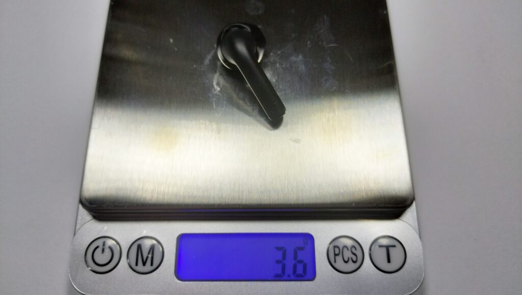 Apple AirPodsと同じぐらいの長さ。イヤホン本体は軽く4g以下となっています。