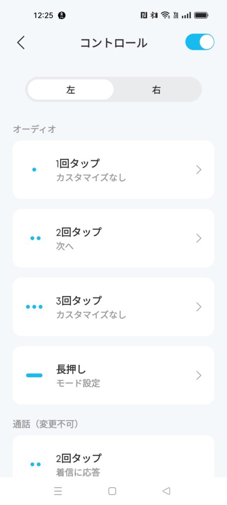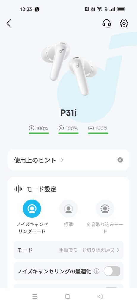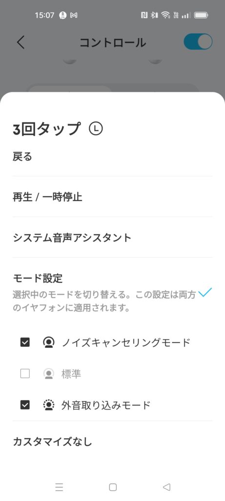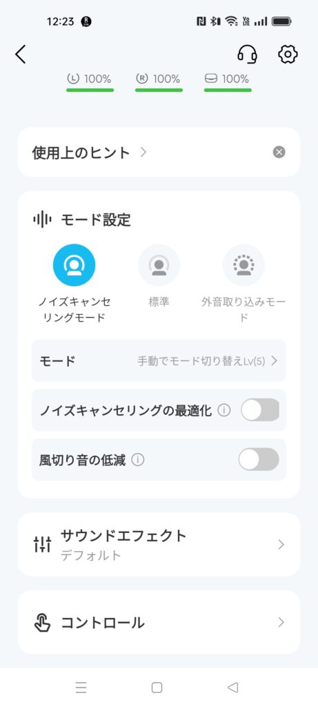 音質関連はアプリのみ。ノイズキャンセリングと外音取り込み機能のモード変更はできるが、自動や手動の切り替えや風切り音設定はアプリからのみになっています。