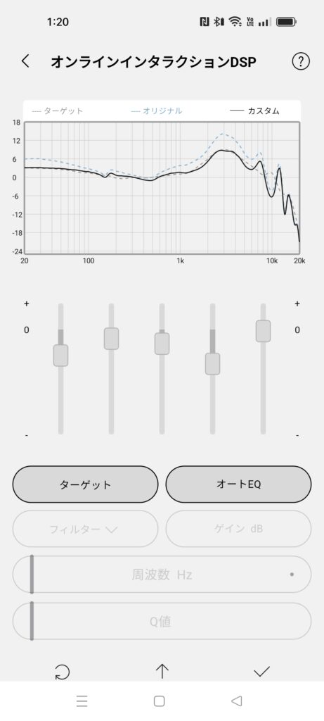 ”オンラインインタラクションDSP”の右上の部分にボタンがあり、そこをタップすると調整画面が出ます。