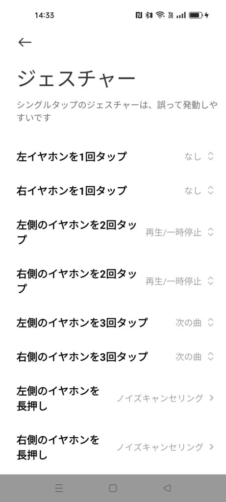 | ・モード変更(ノーマル・ノイキャン・外音取り込み) ・ジェスチャー(ボタン操作変更) ・オーディオ効果(プリンセット・イコライザー) ・追加設定(デュアルデバイス・イヤホン名変更) ・イヤホンを探す(音で知らせるタイプ) ・アップデート(サインインが必要) |
